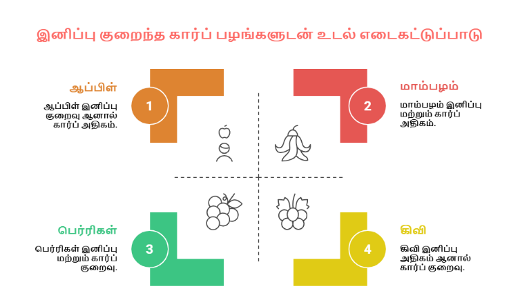 பலர் எல்லா பழங்களும் அதிக சர்க்கரை கொண்டவை என்று நினைக்கிறார்கள். ஆனால் சில பழங்கள் நார்ச்சத்து மற்றும் பழ சர்க்கரை(Fructose) உள்ளதால் மெதுவாகச் செரிமானமாகின்றன. இதனால் ரத்தச் சர்க்கரை திடீரென அதிகரிக்காது. தினசரி உணவில் இப்படிப் பழங்களைச் சேர்ப்பது உடல் எடையை கட்டுப்படுத்தவும், ஆரோக்கியமான உணவுகளுக்கு பழக்கப்படுத்தவும் உதவுகிறது.